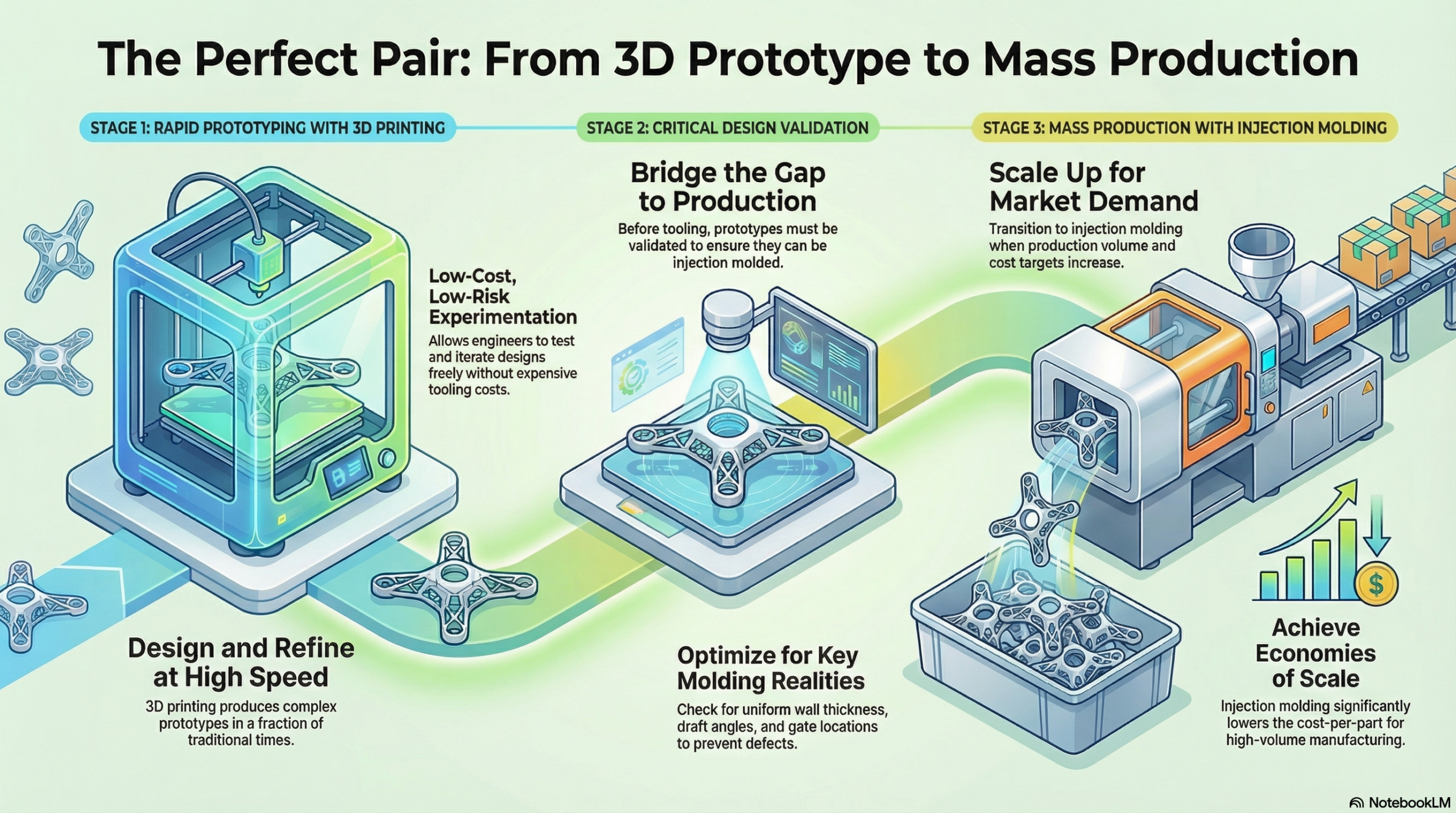 Combining 3D print prototyping with scientific injection molding for mass production can provide benefits that streamline product development. By utilizing additive manufacturing for initial prototyping, engineers can rapidly iterate designs and verify functionality before committing to expensive production tools. This podcast discusses those benefits, while focusing on the importance of design validation to ensure prototypes translate effectively into moldable parts, accounting for factors like resin flow and wall thickness. This integrated approach reduces manufacturing risks, lowers long-term costs, and accelerates the timeline for market launch.